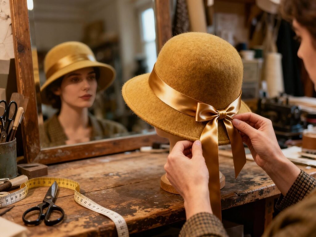 The blocking process remains fundamentally unchanged from 1920s techniques. Felt is steamed and shaped over wooden forms (blocks) specifically sized and shaped for cloche proportions. This hand-blocking creates the precise curves and angles that define the style.