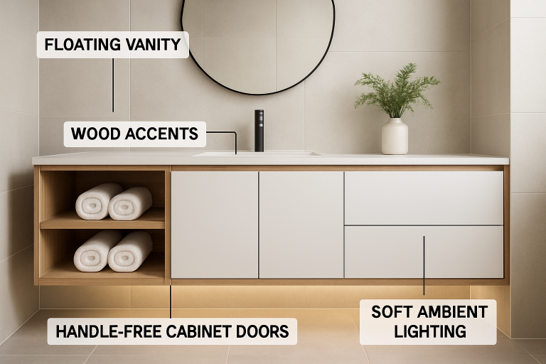 If you find inspiration in cabinetry, these ideas translate to other spaces in your home as well. For instance, many modern principles used in bathrooms—like handle-free cabinetry and inventive material pairings—apply just as beautifully to kitchen cabinets, creating a cohesive, updated look throughout your interiors.